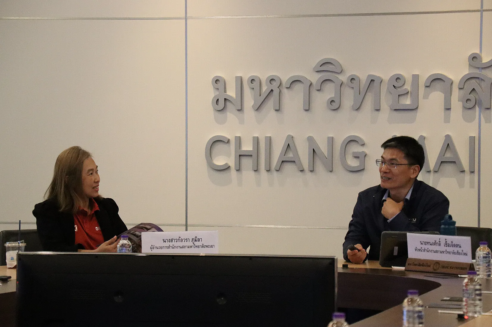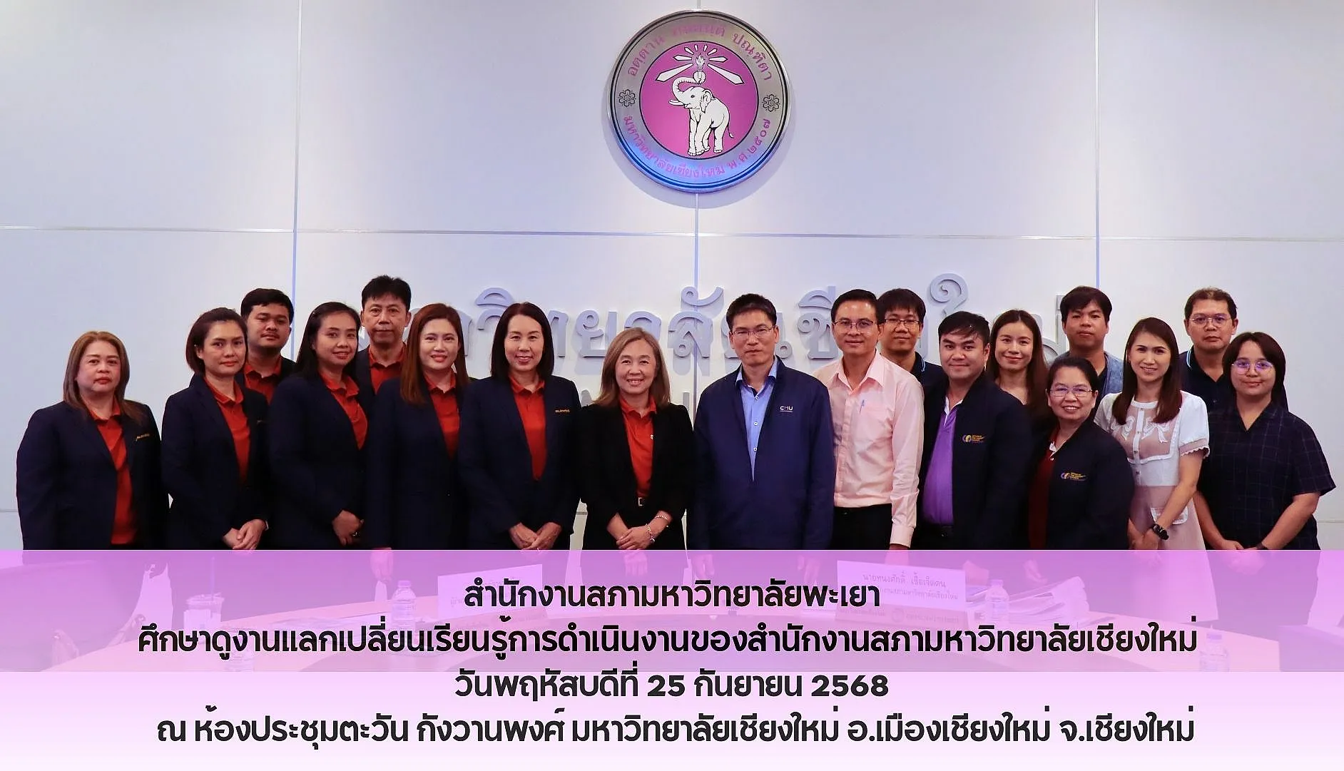 เมื่อวันพฤหัสบดีที่ 25 กันยายน 2568 นางสาวกัลวรา ภูมิลา ผู้อำนวยการสำนักงานสภามหาวิทยาลัยพะเยา นำบุคลากรสำนักงานสภามหาวิทยาลัยพะเยา เข้าร่วมศึกษาดูงานแลกเปลี่ยนเรียนรู้การดำเนินงานของสำนักงานสภามหาวิทยาลัย มหาวิทยาลัยเชียงใหม่ ณ ห้องประชุมตะวัน กังวานพงศ์ มหาวิทยาลัยเชียงใหม่ โดยได้รับเกียรติจาก นายทนงศักดิ์ เชื้อเจ็ดตน หัวหน้าสำนักงานมหาวิทยาลัยเชียงใหม่ พร้อมด้วยบุคลากร ให้การต้อนรับ