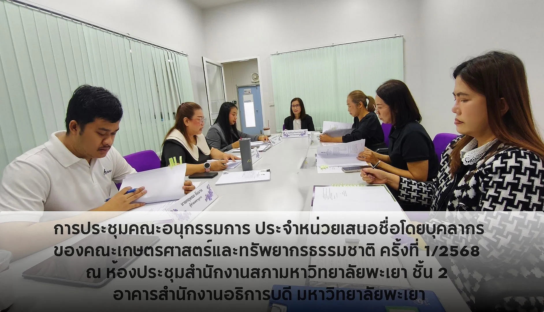 วันพุธที่ 19 พฤศจิกายน 2568 เวลา 10.00 น. รองศาสตราจารย์กันย์กัญญา ใจการวงค์สกุล กรรมการสภามหาวิทยาลัยพะเยา ประเภทคณาจารย์ประจำ เป็นประธานการประชุมคณะอนุกรรมการ ประจำหน่วยเสนอชื่อโดยบุคลากรของคณะเกษตรศาสตร์และทรัพยากรธรรมชาติ ครั้งที่ 1/2568ณ ห้องประชุมสำนักงานสภามหาวิทยาลัยพะเยา ชั้น 2 อาคารสำนักงานอธิการบดี มหาวิทยาลัยพะเยา เพื่อเตรียมความพร้อมในการตั้งหน่วยรับการเสนอชื่อผู้สมควรดำรงตำแหน่งคณบดีคณะเกษตรศาสตร์และทรัพยากรธรรมชาติ โดยบุคลากรของคณะเกษตรศาสตร์และทรัพยากรธรรมชาติ รวมทั้งชี้แจงการดำเนินงานและมอบหมายหน้าที่เพื่อให้คณะอนุกรรมการฯ ปฏิบัติหน้าที่ในการตั้งหน่วยรับการเสนอชื่อผู้สมควรดำรงตำแหน่งคณบดีคณะเกษตรศาสตร์และทรัพยากรธรรมชาติในวันพฤหัสบดีที่ 27 พฤศจิกายน 2568 ให้เป็นไปด้วยความเรียบร้อยต่อไป