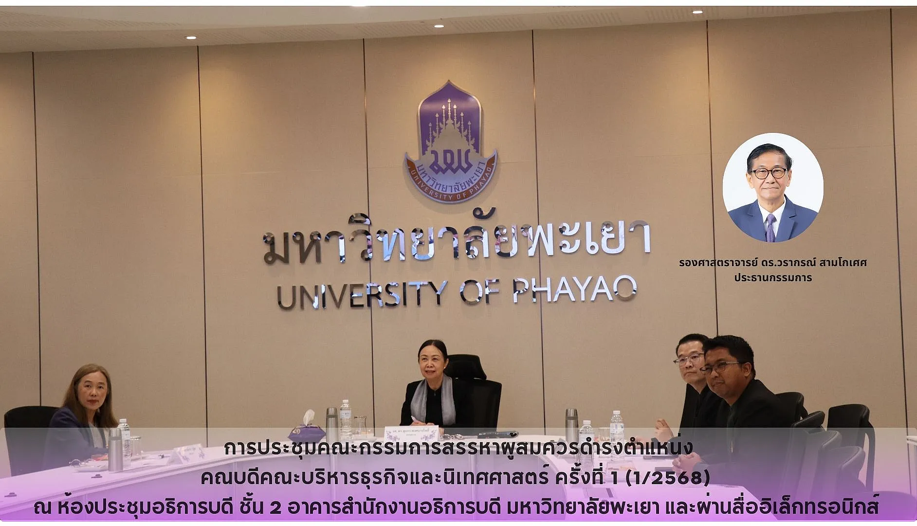 วันอังคารที่ 23 ธันวาคม 2568 เวลา 13.30 น. สำนักงานสภามหาวิทยาลัยพะเยา จัดประชุมคณะกรรมการสรรหาผู้สมควรดำรงตำแหน่งคณบดีคณะบริหารธุรกิจและนิเทศศาสตร์ ครั้งที่ 1 (1/2568) ณ ห้องประชุมบวร รัตนประสิทธิ์ ชั้น 2 อาคารสำนักงานอธิการบดี มหาวิทยาลัยพะเยา จังหวัดพะเยา และผ่านสื่ออิเล็กทรอนิกส์