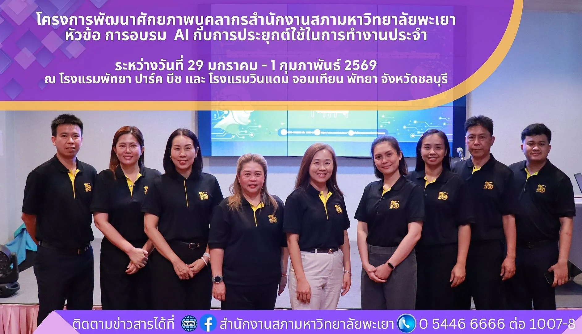 สำนักงานสภามหาวิทยาลัยพะเยา ร่วมกับกองแผนงาน จัดโครงการพัฒนาศักยภาพบุคลากร โดยการอบรมหัวข้อ “AI กับการประยุกต์ใช้ในการทำงานประจำ” เพื่อเสริมความรู้และทักษะด้านเทคโนโลยีดิจิทัลให้แก่บุคลากร เพื่อรองรับการทำงานในยุคปัจจุบันที่มุ่งเน้นการนำปัญญาประดิษฐ์ (AI) มาช่วยเพิ่มประสิทธิภาพ และยกระดับคุณภาพการทำงานภายในส่วนงาน โดยโครงการดังกล่าวจัดขึ้นระหว่าง วันที่ 29 มกราคม – 1 กุมภาพันธ์ 2569 ณ โรงแรมพัทยา ปาร์ค บีช และ โรงแรมวินแดม จอมเทียน พัทยา จังหวัดชลบุรี