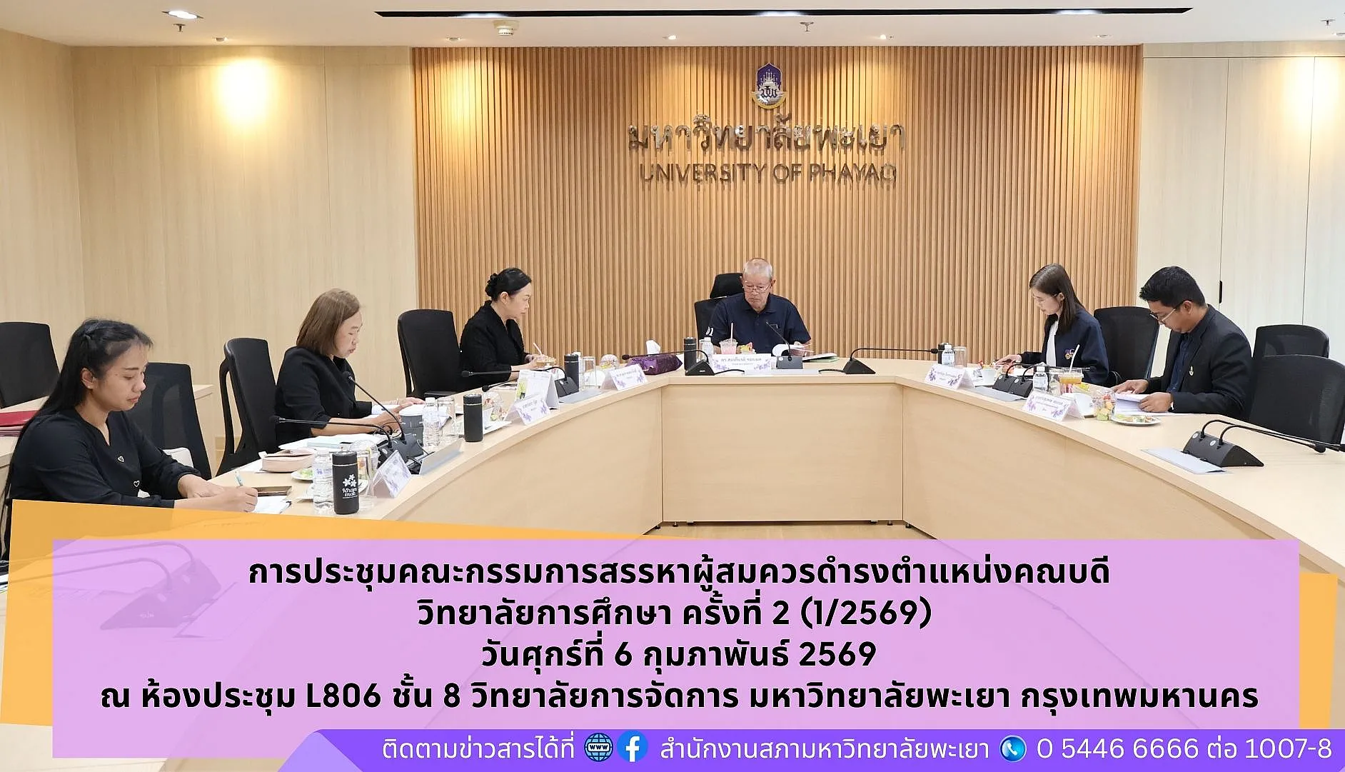 เมื่อวันศุกร์ที่ 6 กุมภาพันธ์ 2569 เวลา 13.00 น. สำนักงานสภามหาวิทยาลัยพะเยา จัดประชุมคณะกรรมการสรรหาผู้สมควรดำรงตำแหน่งคณบดีวิทยาลัยการศึกษา ครั้งที่ 2 (1/2569) ณ ห้องประชุม L806 ชั้น 8 วิทยาลัยการจัดการ มหาวิทยาลัยพะเยา อาคารเวฟเพลส ถนนวิทยุ แขวงลุมพินี เขตปทุมวัน กรุงเทพมหานคร