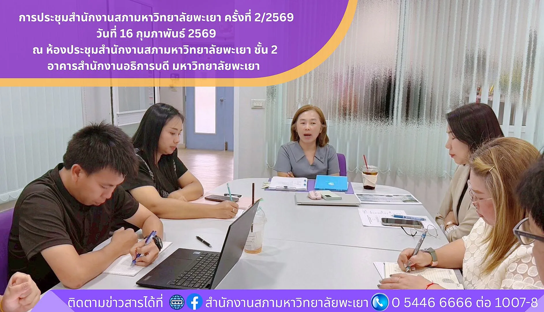 เมื่อวันจันทร์ที่ 16 กุมภาพันธ์ 2569 เวลา 09.30 น. นางสาวกัลวรา ภูมิลา ผู้อํานวยการสำนักงานสภามหาวิทยาลัยพะเยา เป็นประธานการประชุมสำนักงานสภามหาวิทยาลัยพะเยา ครั้งที่ 2/2569 ณ ห้องประชุมสำนักงานสภามหาวิทยาลัยพะเยา ชั้น 2 อาคารสํานักงานอธิการบดี มหาวิทยาลัยพะเยา อําเภอเมืองพะเยา จังหวัดพะเยา