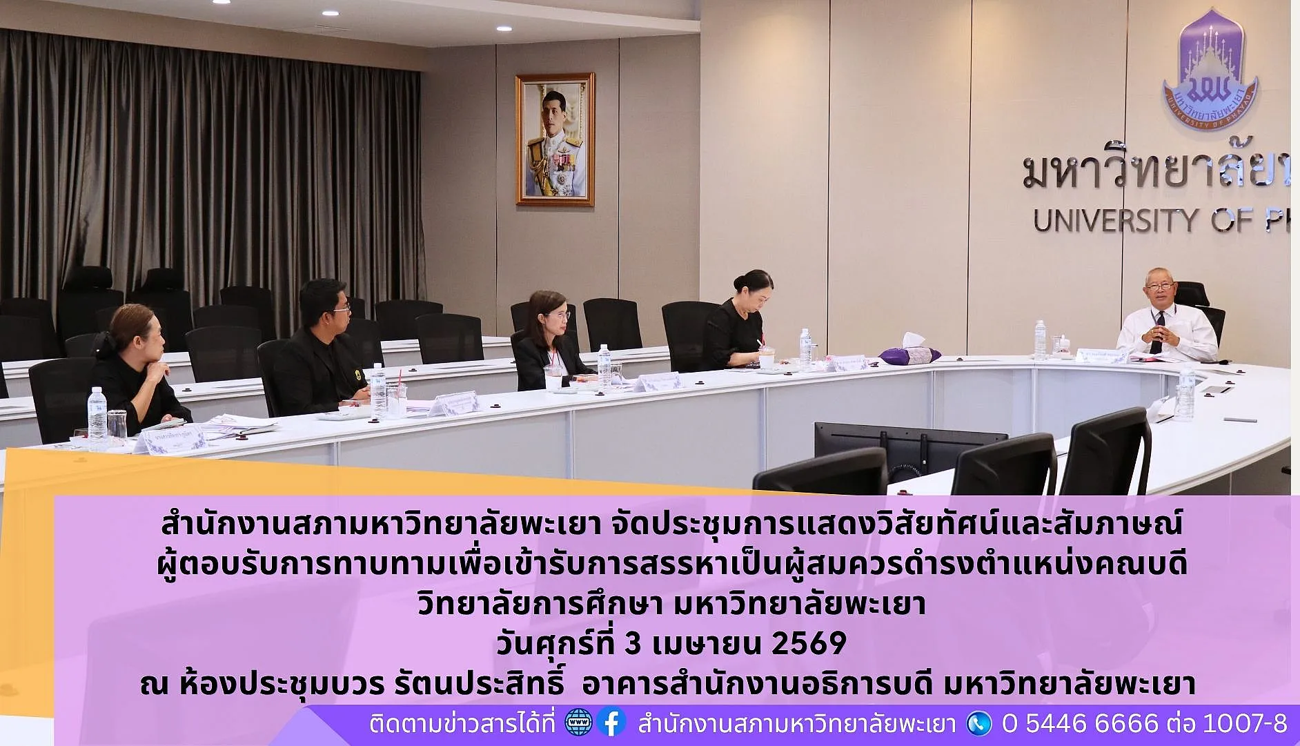 เมื่อวันศุกร์ที่ 3 เมษายน 2569 เวลา 13.30 น. สำนักงานสภามหาวิทยาลัยพะเยา จัดประชุมการแสดงวิสัยทัศน์และสัมภาษณ์ผู้ตอบรับการทาบทามเพื่อเข้ารับการสรรหาเป็นผู้สมควรดำรงตำแหน่งคณบดีวิทยาลัยการศึกษา ณ ห้องประชุมบวร รัตนประสิทธิ์ อาคารสำนักงานอธิการบดี มหาวิทยาลัยพะเยา โดยมีผู้เข้าร่วมประชุม ประกอบด้วย