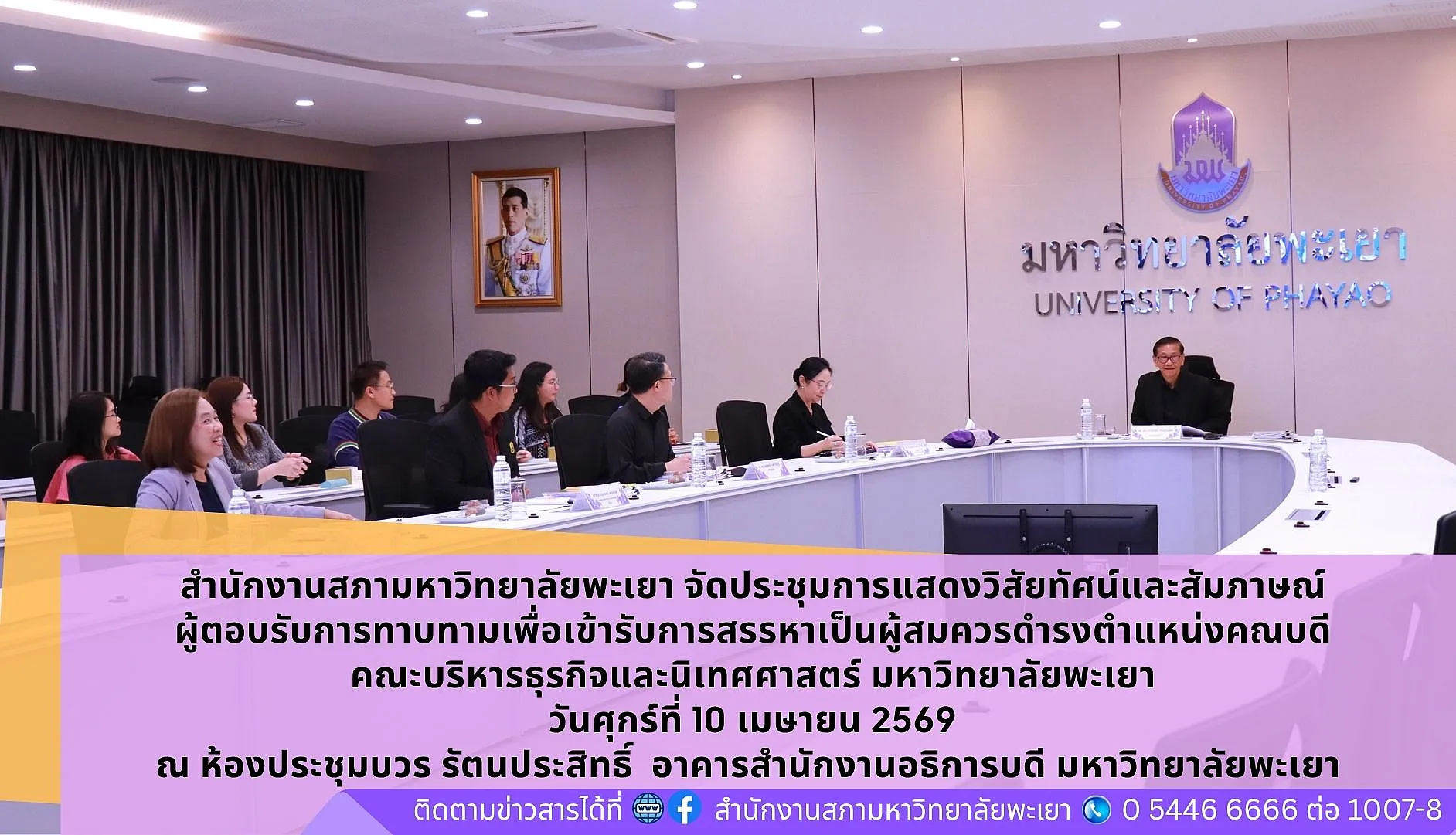 เมื่อวันศุกร์ที่ 10 เมษายน 2569 เวลา 13.30 น. สำนักงานสภามหาวิทยาลัยพะเยา จัดประชุมการแสดงวิสัยทัศน์และสัมภาษณ์ผู้ตอบรับการทาบทามเพื่อเข้ารับการสรรหาเป็นผู้สมควรดำรงตำแหน่งคณบดีคณะบริหารธุรกิจและนิเทศศาสตร์ ณ ห้องประชุมบวร รัตนประสิทธิ์ อาคารสำนักงานอธิการบดี มหาวิทยาลัยพะเยา โดยมีผู้เข้าร่วมประชุม ประกอบด้วย