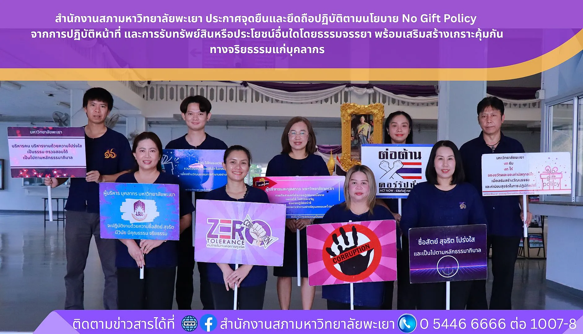 สำนักงานสภามหาวิทยาลัยพะเยา ประกาศจุดยืนและยึดถือปฏิบัติตามนโยบาย No Gift Policy จากการปฏิบัติหน้าที่ และการรับทรัพย์สินหรือประโยชน์อื่นใดโดยธรรมจรรยา พร้อมเสริมสร้างเกราะคุ้มกันทางจริยธรรมแก่บุคลากร